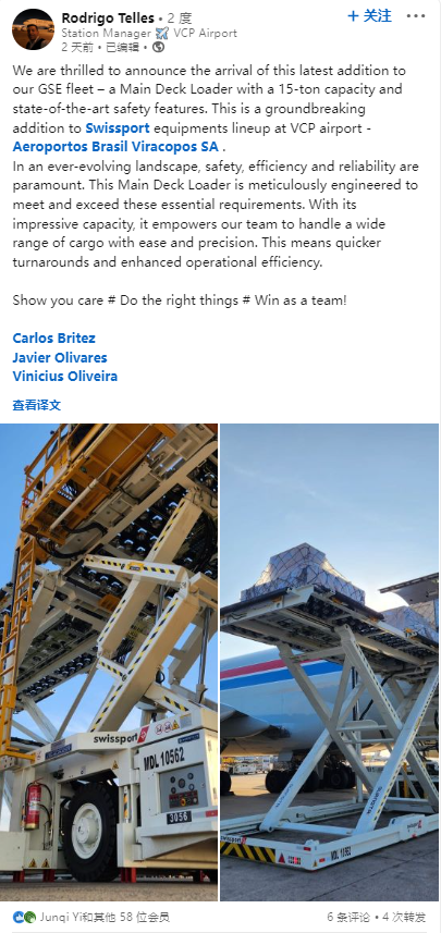 近期,由于威海廣泰集裝貨物裝載機(jī)在海外市場的出色作業(yè)表現(xiàn),全球領(lǐng)先的地服公司Swissport的一位相關(guān)代表在領(lǐng)英發(fā)文為廣泰產(chǎn)品點(diǎn)贊!我們很高興地宣布我們GSE車隊(duì)的最新成員的到來——一臺承載重量為15噸、具有最先進(jìn)安全功能的集裝貨物裝載機(jī)。這是Swissport在坎皮納斯國際機(jī)場的…