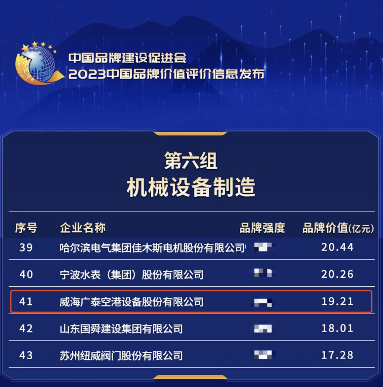 2023年5月11日,新華社、浙江省人民政府、中國品牌建設促進會、中國資產(chǎn)評估協(xié)會等單位在浙江德清聯(lián)合發(fā)布“2023中國品牌價值評價信息”。威海廣泰空港設備股份有限公司(簡稱“威海廣泰”)在此次發(fā)布評價機械設備制造組中,品牌價值獲評為19.21億元?!爸袊放苾r值評價信息發(fā)布”…